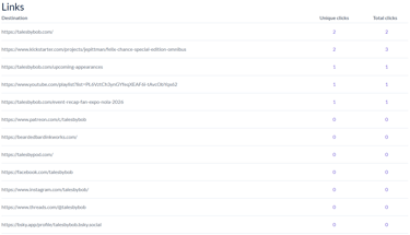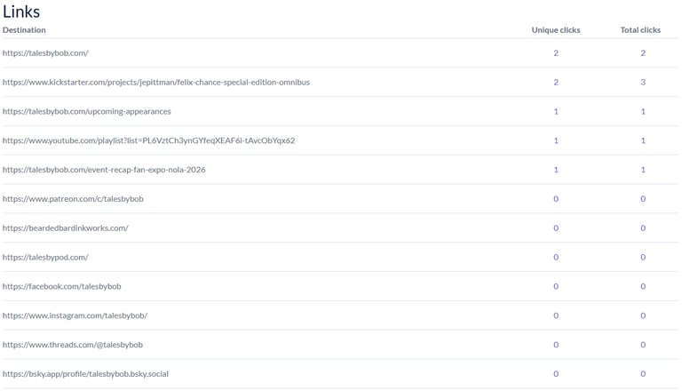 And here are the stats on those clicks. So this shows all the links you could have clicked in this email. To be fair, some of them are the default ones that go at the bottom, connecting you to my social media. But I was pleased that two folks went to check out my buddy J.E. Pittmans kickstarter, and someone clicked the link to see the episodes of Page Numbers. Otherwise it was folks checking out stuff on my site. Good stuff!
