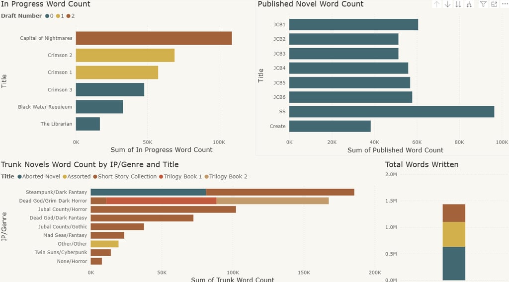 Step one is cleaning up my data, which I have already begun. Once that is done, I have to plug it all in and start building out the dashboards. But as a proof of concept I built something I have wanted for a long time: a word counter. You can see a screen shot of it below. This will allow me to keep folks much more up to date on just where I stand with my various projects.